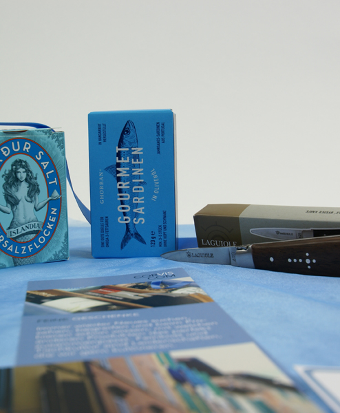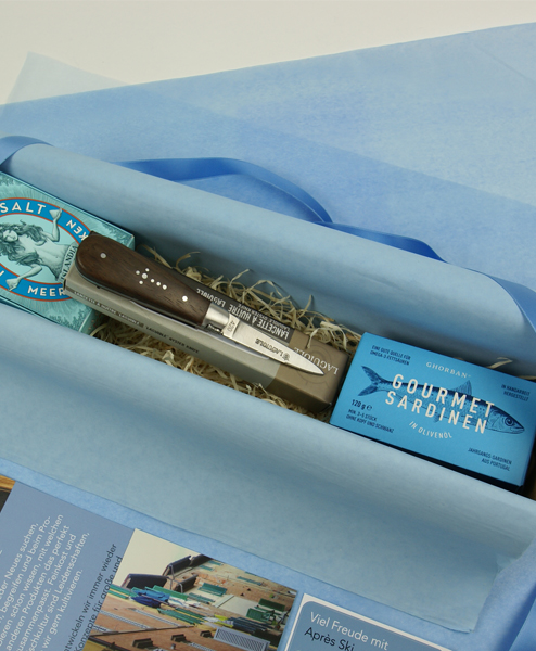 Eine Gourmetgeschenkbox für alle, die vom Meer träumen. Ganz gleich, ob Sie eher ein Genießer mediterraner Fischspezialitäten sind oder lieber selbst Hand anlegen und fangfrische Krusten-und Schalentiere aus dem Atlantik bevorzugen, dieses Paket wird Freude bereiten. Die feinen portugiesischen Sardinenfilets sind einfach ein Geschmackserlebnis. Mit dem schönen Austernöffner von Laguiole Coriolis lassen sich die Schalentiere leicht und ohne viel Kraft öffnen. Wer keine Austern mag, kann aber auch den Parmesan damit brechen.