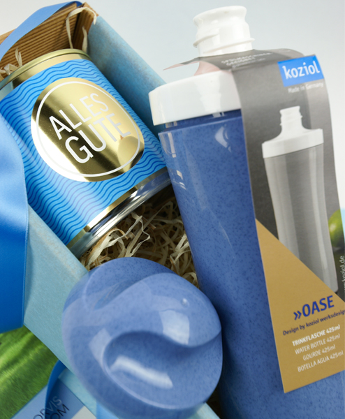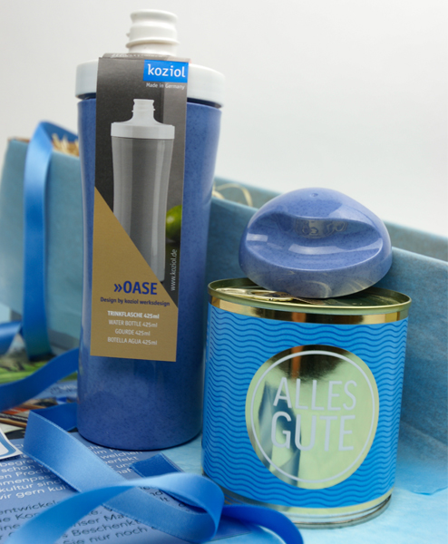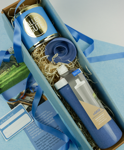 „Alles Gute” ist ein Geschenk-Allrounder für alle Anlässe. Als Willkommensgeschenk fürs Büro, als Geburtstagsgeschenk oder für Kunden und Mitarbeiter zum Jahresende. Die patentierte Trinkflasche aus der Organic-Kollektion von Koziol gibt es in mehreren Farben. Der Deckel besteht aus zwei Teilen, sodass man gut trinken und die Flasche trotzdem leicht reinigen kann. Der leckere Cancake aus dem Schwarzwald hat an der Seite noch eine goldene Kerze für den Beschenkten.
