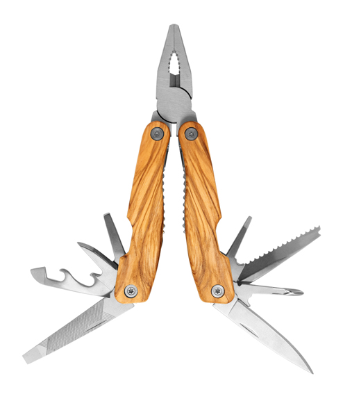 Ein selten schönes Multitool mit Griffen aus fein gemasertem Olivenholz. Eigentlich zu schön für einen Gebrauchsgegenstand, aber genau dazu ist es konzipiert. Es ist nicht nur ein Hingucker sondern auch von bester Qualität und mit 12 Funktionen ein professionelles Multitalent für jedes handwerkliche Problem. Eine praktische Gürteltasche aus schwarzem Nylon ist direkt dabei.