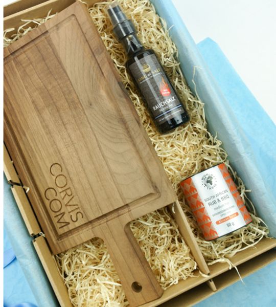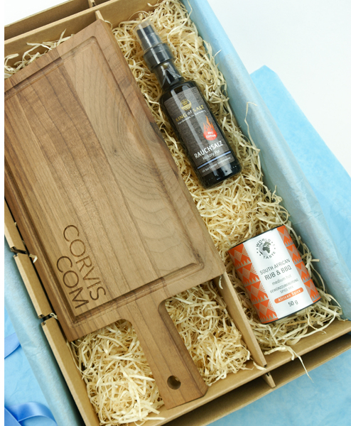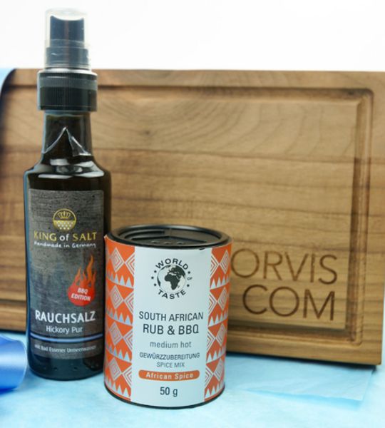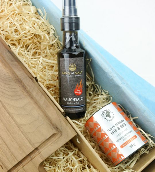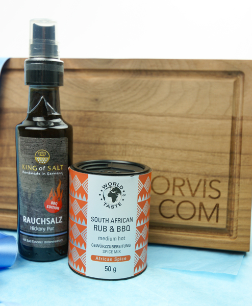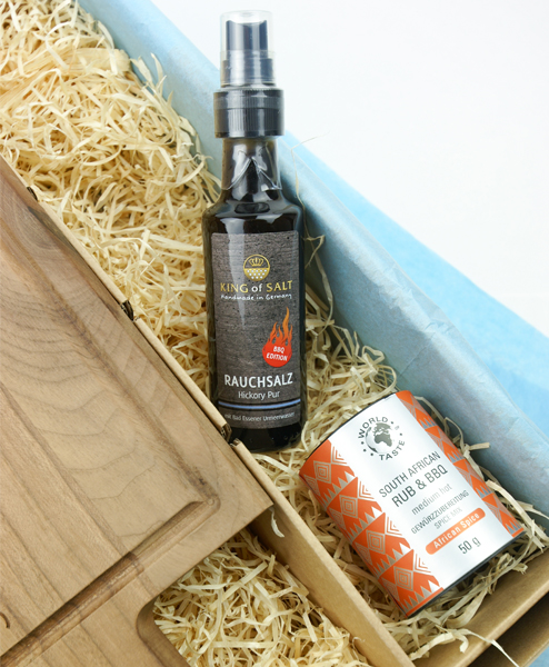 Das schöne massive Schneidebrett ist aus geöltem Walnussholz und sein mit Griff und die Saftrinne eignen es für jede Art Grillgut. Das Hickory Spraysalz ist eine Besonderheit aus Bad Essen und der Südaftrikanische Rub & BBQ von World of Taste, gibt dem knusprigen Fleisch den letzten Schliff.
