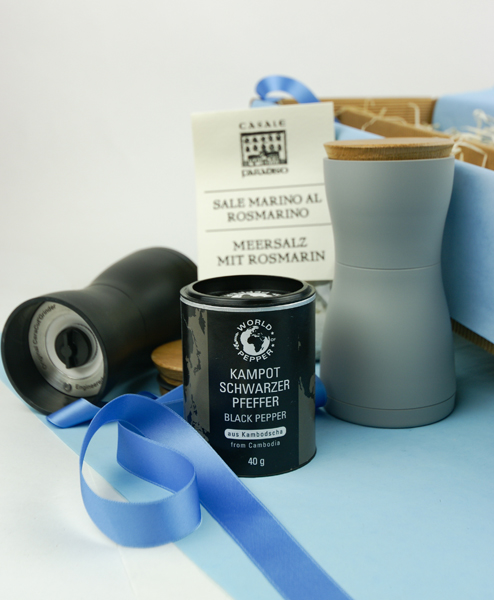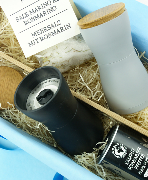 Partnerschaft ist das Thema in diesem Konzept. Hier ist zusammen, was zusammen gehört und sich perfekt ergänzt. Die helle Salzmühle und die dunkle Pfeffermühle von Adhoc tragen den vielsagenden Namen „TWIN". Sie zeichnen sich durch viele durchdachte Eigenschaften, wie das obenliegende Ceracut® Mahlwerk und die Bambusdeckel aus. So rieselt kein Mahlgut aus der Mühle. Wir haben zum Befüllen ein handgeschöpftes Meersalz gewählt, dass mit dem Rosmarin zu einem mediterranen Gewürz wird und mit dem schwarzen Kampot-Pfeffer ein weiteres perfektes Paar bildet. Das Set ist ein kreatives und ausdruckstarkes Gechenk für Kunden und Mitarbeiter.