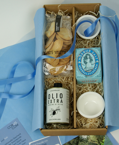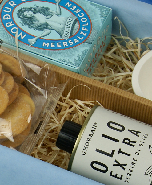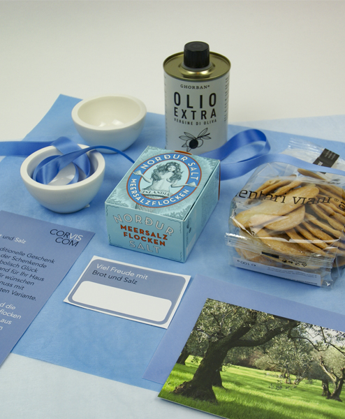 Das traditionelle Geschenk zum Einzug, mit dem der Schenkende Ihnen symbolisch Glück und Wohlstand für Ihr Haus überreicht. Wir wünschen Freude und Genuss mit unserer verfeinerten Variante von Brot und Salz. Feinstes Olivenöl und die isländischen Meersalzflocken in die stilvollen Schalen aus feinem Premium-Porzellan von Villeroy & Boch geben und mit warmem Weißbrot dippen. Die knusprigen Lingue di suocera passen auch einfach pur zu Wein.