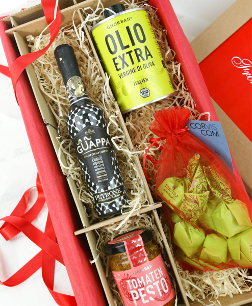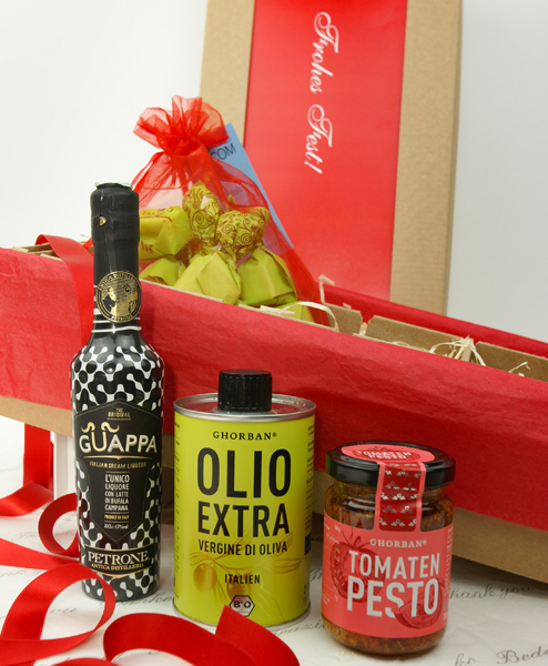 Zwischen Weihnachtsgans und Lebkuchen möchten wir Sie ins winterliche Italien entführen wo man auch zur Weihnachtszeit die Genüsse des Südens auf den Tisch bekommt. Dazu zählt die Kombination aus Italienischem Olio Extra Vergine BIO und Crema di Balsamico genauso wie ein frisches Pesto, hier mal rotes Tomatenpesto, für eine schöne Pasta. Als Dessert gönnen wir Ihnen dann duftende Tartufi al pistacchio, mit grünen Pistazien.