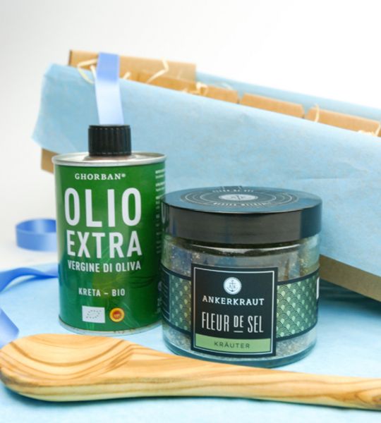 Olivenholzkochlöffel, Olivenöl und Fleur de Sel