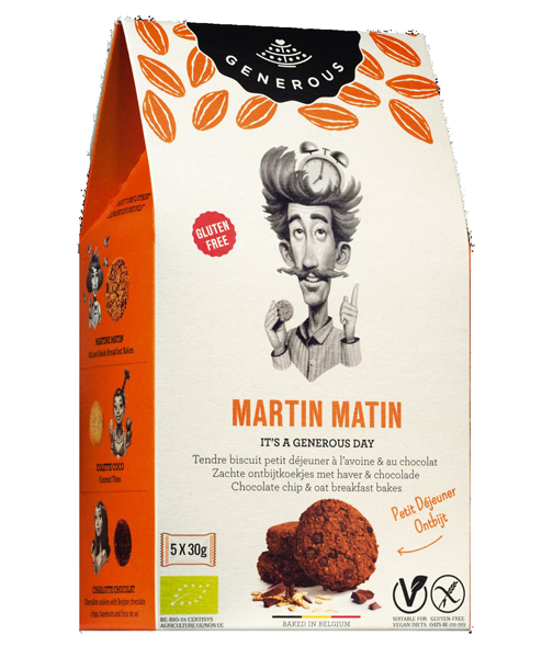 Belgien ist bekannt für gute Pâtisserie. Beim Hersteller Generous aus Brüssel ist der Name Programm. Nach dem Motto „small but generous”, setzt traditionelle Rezepte für seine außergewöhnlichen Kekse so um, dass sie uns sofort beim Öffnen der schönen Retroverpackung, an frisches Gebäck aus Omas Küche erinnern. Hier kommen nur Bio-Zutaten in die Rührschüssel und es wird auch an sonst vernachlässigte Randgruppen unter den Genießern gedacht. In der Variante Martin Matin werden aus Hafer, Schokoflocken, Rohrzucker und Rosinen schokoladige Kekse gebacken.