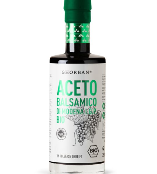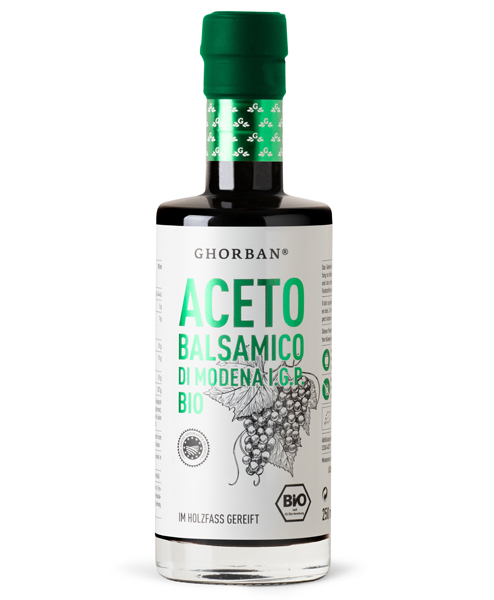 Traditionell in der italienischen Provinz Modena produziert und abgefüllt, überzeugt der Bio Aceto Balsamico durch seine herausragende Qualität. Grund dafür ist die Reifung im Holzfass, die ihm nicht nur seine tiefbraune Färbung sondern auch das dickflüssige, sirupartige Fließverhalten verleiht. Der Ghorban Aceto Balsamico erfüllt den BIO-Standard nach der EG-Öko-Verordnung und ist natürlich frei von Farbstoffen oder Zucker.
