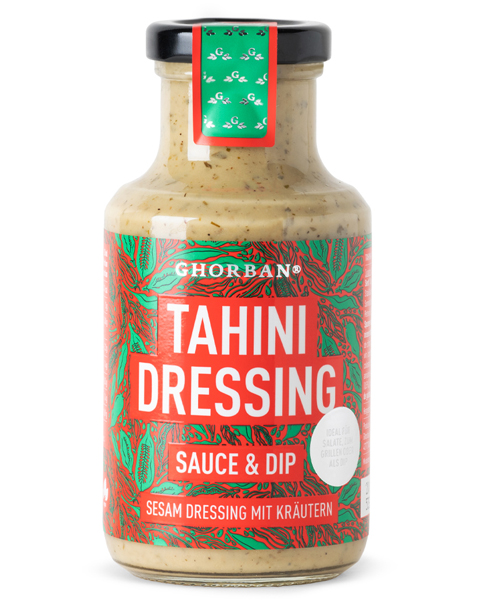 Thymian, Dill und Petersilie verleihen diesem Dressing aus der Produktreihe der GHORBAN® Tahini seinen unverwechselbaren Charakter. Namensgeber für diese Dressings ist eine cremige Paste aus Sesamkörnern, die nach hauseigener Rezeptur mit Senf und Apfelessig verfeinert wird. Sesam zeichnet sich durch ein leicht nussartiges Aroma aus. Darüber hinaus ist er reich an ungesättigten Fettsäuen und Vitamin E. Dieses Dressing passt perfekt zu allen Salaten, als Sauce auf Sandwiches oder als Dip zu Gemüsesticks. Eine besondere Empfehlung ist das Tahini mit Kräutern als Sauce zu gegrilltem Gemüse und Fleisch.