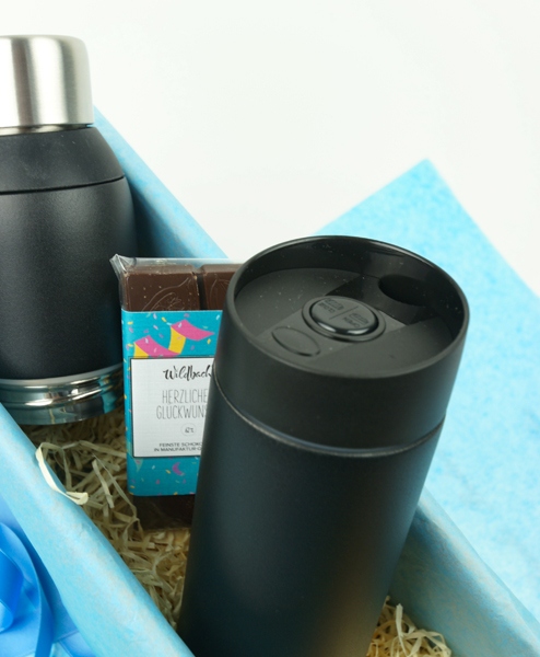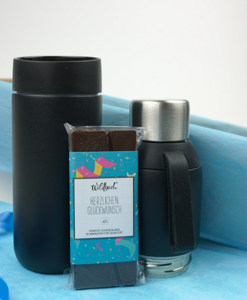 Herzlichen Glückwunsch und willkommen im Team, sagen Sie mit diesem schönen Geschenk für neue Mitarbeiter. Die innovative 2teilige Isolierflasche verwandelt sich im Büro oder im Auto in einen 2Go Thermosbecher, der bequem mit einer Hand geöffnet werden kann. Ob der/die neue Kollege*in darin Kaffee oder kühle Getränke bevorzugt, liegt ganz am Geschcmack. Die leckere Manufaktur-Schokolade passt auf jeden Fall zu beidem.