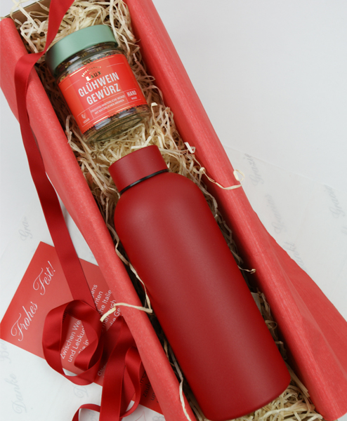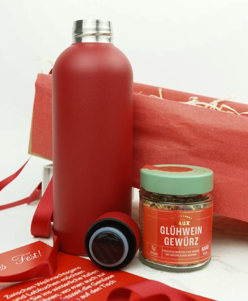Diesen Glühwein müssen Sie nicht schnell trinken, weil er kalt wird. Ganz im Gegenteil, nehmen Sie ihn doch einfach mit, zum Beispiel auf eine winterliche Wanderung. Mit den natürlichen Gewürzen aus dem Hause Laux machen Sie sich einen Glühwein nach Ihrem Geschmack und der bleibt in der super isolierten Trinkflasche von Nordic Drink Ware stundenlang richtig gut warm. So macht eine Pause bei kalten Temperaturen Spaß.