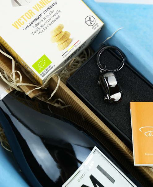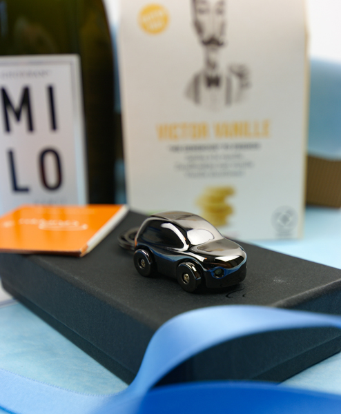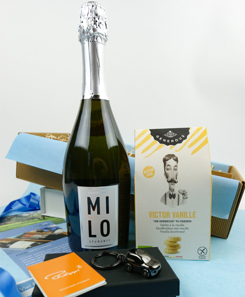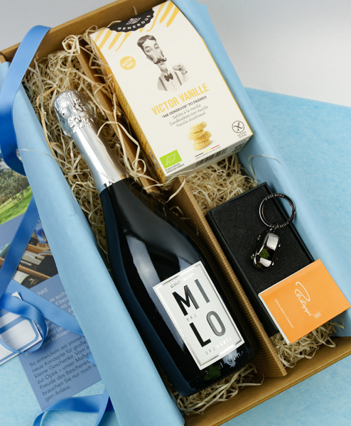 Herzlichen Glückwunsch zum neuen Auto oder auch zum Geburtstag – oder beides? Gute Anlässe zum Feiern gibt es immer. Auf jeden Fall ein Grund zum Anstoßen und das geht mit dem tollen Spumate Brut von Grandi Spumanti hervorragend. Die Bio Butter-Kekse von Victor Vanille vertreten jeden geburtstastorte und sind zudem noch glutenfrei. Das Highlight in diesem Set ist sicher der Schlüsselanhänger Cruiser von Philippi. Er wird dem Beschenkten mit seinen LED-Scheinwerfen lange den Weg leuchten.