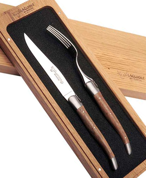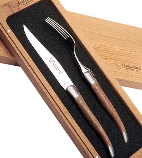 Besteckset für eine Person mit Messer und Gabel aus klassischen Hölzern wie Olive, Wenge, Ebenholz. Jedes Stück ist einzigartig. Klassische Form mit Rückenornament und Biene, Backen matt gebürstet. Das Set wird in einem schönem Echenholzkästchen mit Magnetverschluss geliefert.