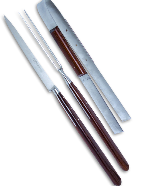 Edles Grillbesteck aus gebürstetem Stahl mit Griffschalen aus Wenge. Die extralangen Griffe halten den Koch weit von der Glut weg. Moderne Form aber mit Bienenenblem. Das Set wird in einem schönem Lederetui geliefert, dass als Rolle zusammengebunden werden kann.
