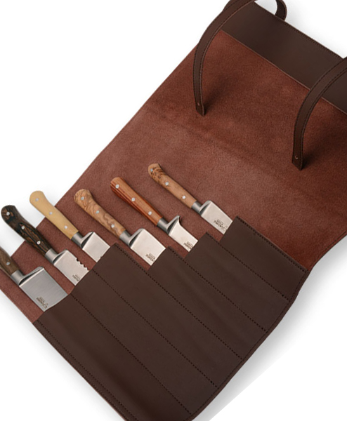 Ein sehr schönes und praktisches Accessoire ist diese Rolle aus dunkelbraunem Rindsleder zur Aufbewahrung edler Kochmesser. Sie hat Fächer für 6 Kochmesser in verschiedenen Größen. Einfach aufrollen und mitnehmen.