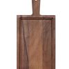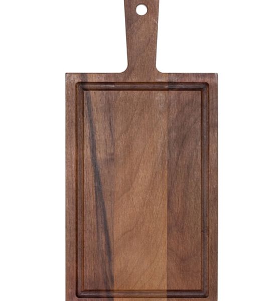 Dieses Walnuss-Schneidebrett mit Griff und Saftrille ist eine luxuriöse und stilvolle Art, Speisen zu servieren. Mit einem 8 cm langen Griff lässt sich dieses Brett leicht tragen. Die Saftrille entlang der Kanten des Bretts sorgt dafür, dass Säfte und Flüssigkeiten von Speisen nicht über die Kante tropfen, was es perfekt zum Servieren von saftigem Obst, Fleisch oder Gemüse macht.