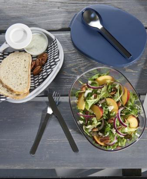 Salatbox mit großem 1300 ml transparentem Fach, das groß genug ist, um den Salat zum Zeitpunkt des Essens zu mischen. Der doppelte Deckel biete ein zusätzliches Fach für Brot oder Besteck. Beinhaltet eine kleine extra Dose für Dressing oder Nüsse. Unzerbrechlich und spülmaschinenfest. Kommt mit einem Verschlussgummiband. BPA frei. 2 Jahre Mepal Garantie.