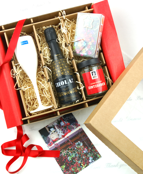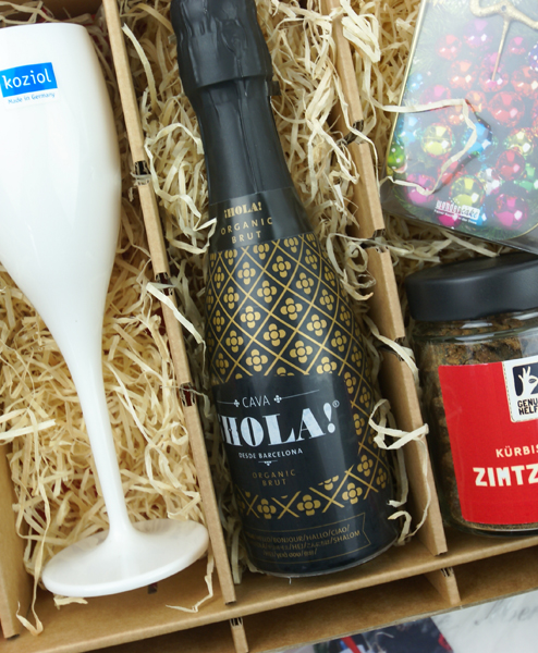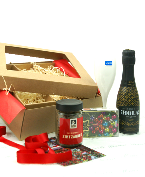 Hiermit können Sie Wertschätzung ohne Worte ausdrücken. In diesem Geschenk ist alles was man zu einer veritablen Silvesterparty braucht. Der Partycake von Wondercandle hat die Wunderkerze gleich dabei und dann Korken knallen lassen bei Cava. Die Kürbiskerne im Zimtmantel sind ein feiner Knabberspaß und der Kelch aus Koziol Superglas macht so gut wie alles mit.