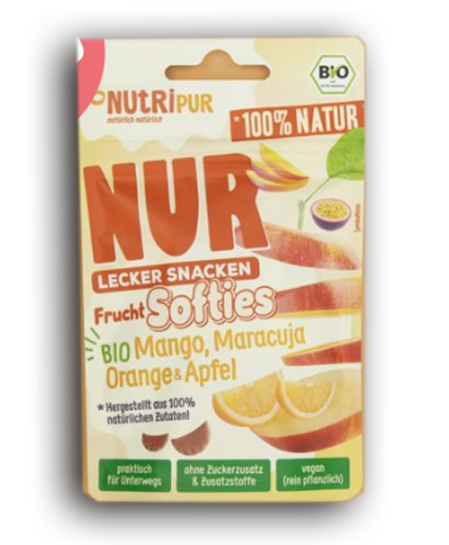 Die NUR Frucht Softies Mango, Maracuja, Orange und Apfel sind eine softe, vegane & glutenfreie Leckerei aus 100% natürlichen Bio Zutaten. Hergestellt aus Fruchtsaftkonzentrat & Fruchtpüree überzeugen die Softies durch ein intensives Fruchtaroma. Die Softies werden OHNE Gelatine hergestellt und enthalten lediglich natürlichen Fruchtzucker. Sie sind die ideale Alternative zu herkömmlichen Süßigkeiten wie Gummibären, Sour Candy oder Wine Gums. Durch den 35 g wiederverschließbaren Beutel sind sie praktisch für unterwegs.