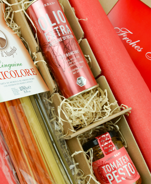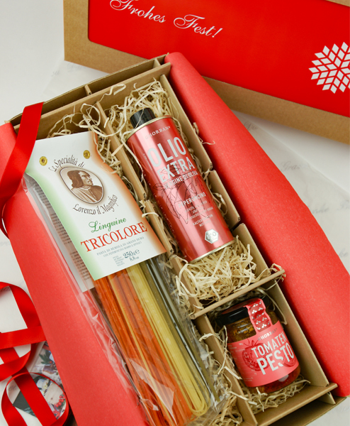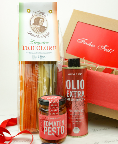 Dieses Feinkostpaket kommt ganz im weihnachtlichen Festtags-Outfit daher, aber innen ist alles weit weg von Eis und Schnee. Hier sind die Zutaten für eine pikante Variante unter den klassischen Pastagerichten. Das Olio Extra Vergine mit Peperoncini bringt eine angenehme Schärfe mit und ergibt mit dem Tomatenpesto eine tolle Pastasauce für die dreifarbigen Linguine von Lorenzo il Magnifico. Kulinarisch sind Sie mit diesem Paket wirklich eher im sonnigen Süden Italiens.