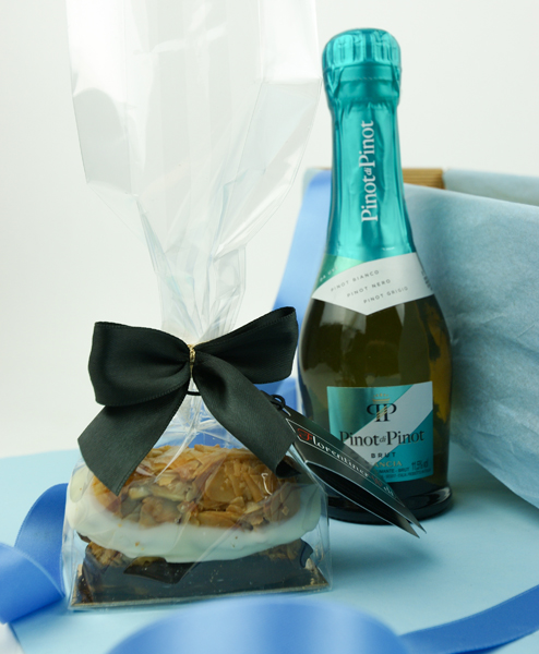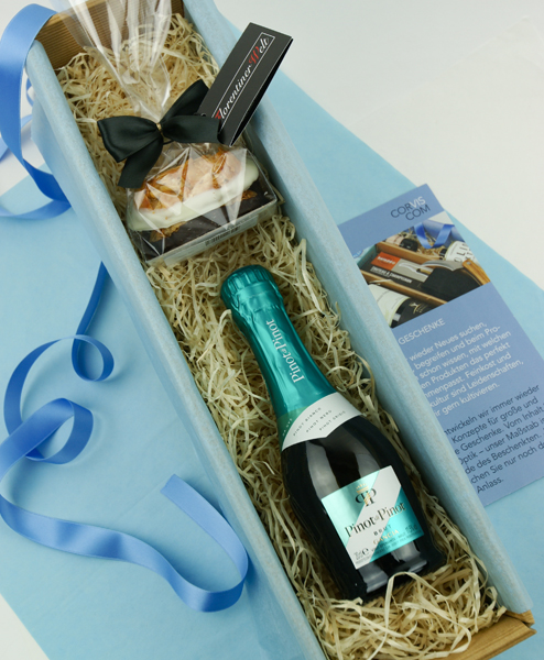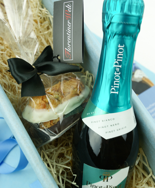 Sie wollen nichts „Großes" verschenken, aber dennoch Ihre Wertschätzung mit einer kleinen, aber feinen Aufmerksamkeit ausdrücken? Dann ist der Piccolo Florentiner perfekt. Die Piccoloflasche Pinot di Pinot Brut von Gancia ist wirklich eine positive Überraschung. Es gibt wenig Brut Sekte, die ihren Geschmack auch in der Piccolo Flasche behalten, aber hier ist das gelungen. Die handgemachten Florentiner von Florentiner Welt aus Österreich sind einfach nur köstlich.