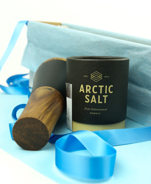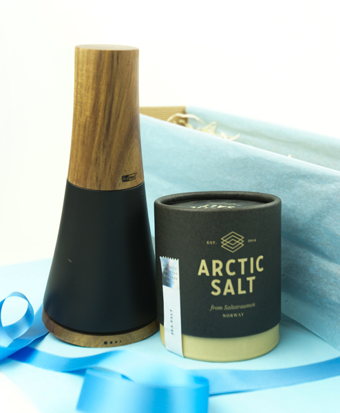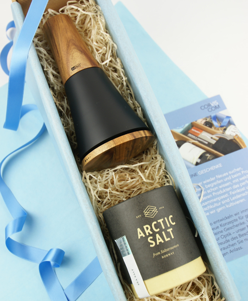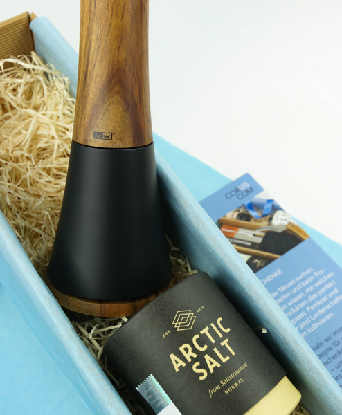 MIt dem exklusiven Geschenkpaket „Polarkreis" machen Sie Kunden glücklich, die schon viel gesehen und probiert haben. Die außergeöhnliche Salz- und Pfeffermühle der Marke Adhoc mit dem treffenden Namen „Spin" hat eine Kreiselbasis über die das Streugut zielgenau platziert wird. Nach dem Abstellen dreht Sie sich dann noch in Position. Das formschöne Objekt wurde 2019 mit einem Designpreis prämiert und ziert mit seiner eleganten Holz- und Lackoptik jeden noch so stilvollen Esstisch. Die seltenen Arctic Salt Meersalzflocken aus dem Polarmeer passen mit ihrer eleganten Packung gut dazu und sind kulinarisch ein noch wenig bekanntes Highlight.