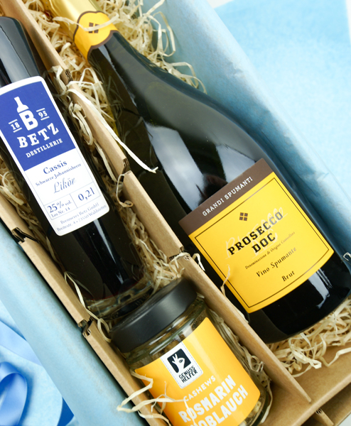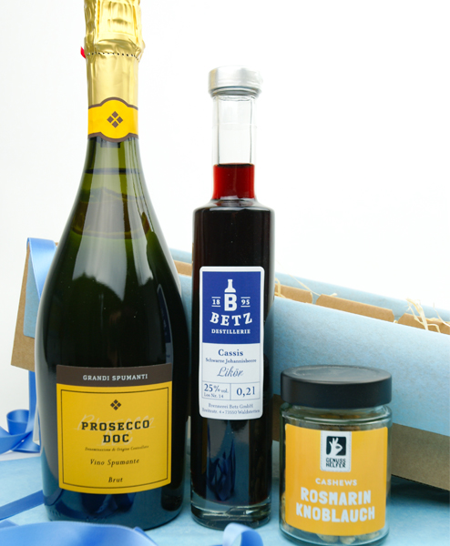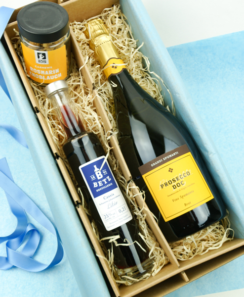 Geschenkbox mit Prosecco, Creme de Cassis und Kürbiskernen