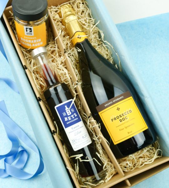 Prosecco royal ist ein länderübergreifendes kulinarisches Erlebnis. Das Geschenkpaket vereint zwei europäische Klassiker. Besten italienischen Prosecco DOC Brut von Grandi Spumanti und ein cremiger Cassis Likör aus der traditionstreichen Manufaktur Betz. Da wird mancher Kir royal einfach nur blass. Gekrönt wird dieses Genusspaket noch mit den frisch gerösteten Kürbiskernen im Zimtmantel vom Bremer Gewürzhandel. Die Etiketten können für Ihre Kunden personalisiert werden.