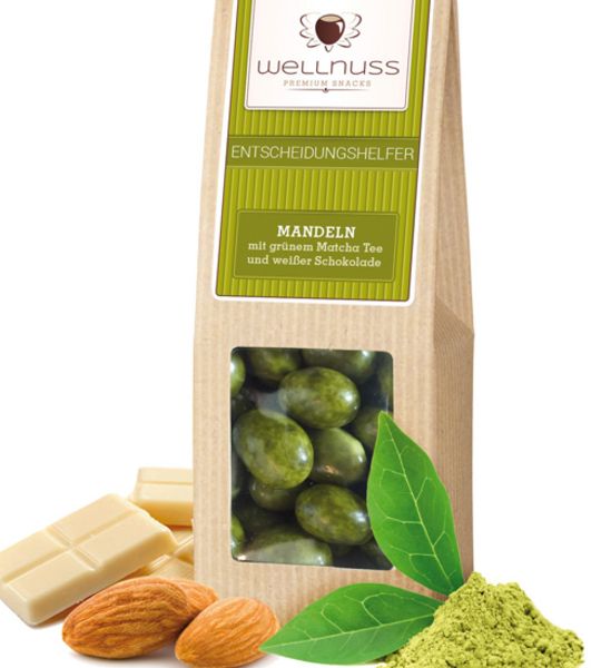 Der „Entscheidungshelfer" von Wellnuss gibt mit seiner Kruste aus belebendem Matcha-Tee im richtigen einen Impuls. Weiche Mandelkerne umhüllt von einer Mischung aus Tee und weißer Schokolade, das schmeckt nach Sommer pur.