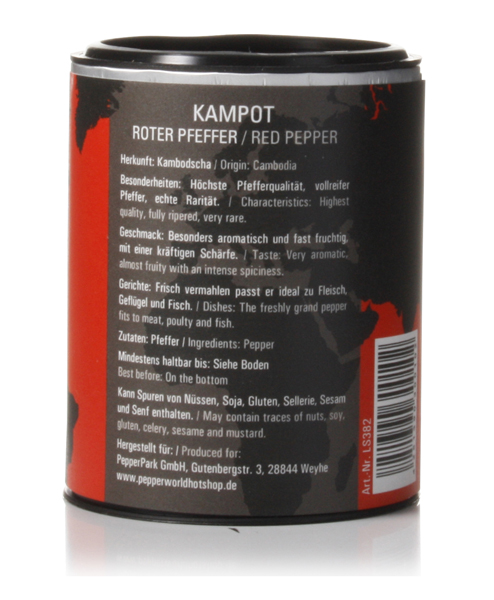 Roter Kampot Pfeffer ist reifer Pfeffer mit Schale aus Kambodscha. Geschmacklich ist dieses Naturprodukt sehr aromatisch und scharf. Namensgebend für den speziellen Kampot Pfeffer ist eine Region in Kambodscha. Das Gebiet liegt in der Nähe vom Golf von Thailand. In dieser Region herrscht ein schwül-heißes Klima, welches in Kombination mit den lehmigen Böden, optimale Bedingungen für den Anbau von Pfeffer schafft. Egal, welche Farbe ein Pfeffer hat, er wird immer von derselben Pflanze geerntet. Die verschiedenen Farben sind nur ein Hinweis auf einen unterschiedlichen Reifegrad des Pfeffers. Der rote Pfeffer ist die ausgereifte Version der Beeren, inklusive Schale. Roter Pfeffer gilt als eine echte Rarität, weil die Zucht mit hohen Risiken verbunden ist. Um ein optimales Ergebnis beim Würzen zu erzielen, sollten die ganzen Pfefferkörner auf jeden Fall zermahlen, so kann er sein volles roma entfalten.