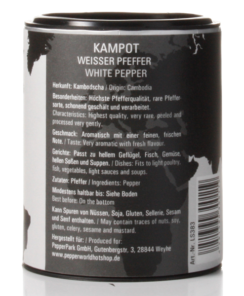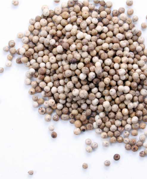 Seine Farbe bekommt weißer Pfeffer weil durch Waschen die Schale und das Fruchtfleisch abfallen und nur der helle Kern übrig bleibt, der dann durch Trocknung in der Sonne noch weiter bleicht. Weißer Pfeffer ist intensiver als schwarzer Pfeffer aber im Geruch eher dezent. Er passt gut zu Fisch, Meeresfrüchten oder hellen Suppen.
